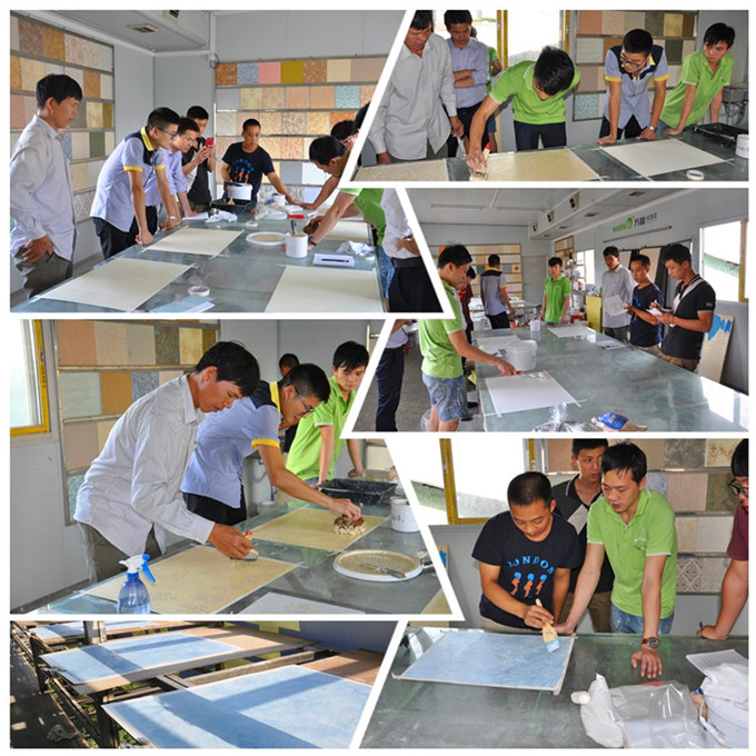會(huì)議之后,學(xué)員們跟陳工等施工技術(shù)人員在樣板制作室學(xué)習(xí)藝術(shù)涂料的施工工藝及實(shí)操。我們的師傅一遍施工,一邊為學(xué)員仔細(xì)講解施工步驟以及施工中的每一個(gè)須注意的小細(xì)節(jié)。學(xué)員們個(gè)個(gè)全神貫注,將要點(diǎn)記錄在筆記本上。隨后學(xué)員們?cè)趲煾档闹更c(diǎn)下都能獨(dú)立完成2款以上的藝術(shù)涂料施工。
